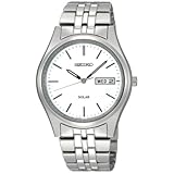 A Seiko watch with a sunny disposition. Stainless steel bracelet and round case. Silver dial features day/date window, logo and stick indices. Ten-month energy storage. Quick-start function and energy depletion warning. Solar quartz movement. Water resistant to 30 meters. Three-year limited warranty.Solar. No battery change required and powered by all types of light. Solar cell with high performance electricity generation. Energy-efficient movement with long power reserve. This dress watch has a brushed and polished stainless steel case and bracelet which creates an elegant finish. The timepiece is constructed with a durable crystal that protects the white dial. LumiBrite hands and English/Spanish day/date calendar. 30 meters water resistant. Read more