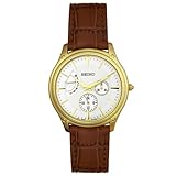 Our stainless steel watch is accented with 22K gold over stainless surrounding the bezel and buckle on the band. The watch features a white dial, 31-day calendar display, 24-hour display, second hand and genuine brown leather band. The dial measures approximately 1-1/2 inches in diameter. The band measures approximately 8 1/4 inches in length, 3/4 inch in width (at the widest point) and includes a buckle clasp. The watch is water tested up to 30MM and will withstand splashes of water or rain but should not be worn while swimming or diving. A manufacturer's 3-year limited warranty is also included with this watch.This intriguing and elegant Retrograde Date Indicator watch from Seiko features a striking round ivory dial with a retrograde date indicator between nine and 10 o'clock, plus a 24-hour timer at six o'clock and a date function at three o'clock. Time is easy to tell with simple gold-tone dash indexes and gold-tone hour, minute, and seconds hands. This functionality is set behind a Hardlex window in a 41-millimeter gold-tone stainless steel case and bezel, stylishly buckled to your wrist by a brown alligator leather band. The watch is powered by Japanese quartz, is water resistant to 98 feet, and is backed by a 3-year limited manufacturer's warranty. Read more