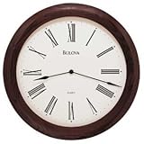 The crisp face looks great with large roman numerals and streamlined black hands. Smartly framed in a solid wood case with a high gloss piano finish over mahogany stain, this will blend well in many rooms. Includes protective glass lens. Takes one AA battery (not included). Quartz movement. 24" diameter. 2 1/2" deep. Read more