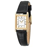 This classic Seiko Ladies' watch features a black leather strap with buckle clasp. The gold tone case is emphasized by a rectangular white dial that feature black hands and Roman numerals designed for timeless appeal. Cabochon Crown. 30 meters water resistant. Matching men’s watch also available, model SNF672. Read more