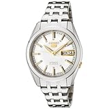 For those wanting to keep it simple but still slightly formal, the Seiko White Dial Stainless Steel Watch might just fit the bill. Its polished stainless steel case and bracelet-style band project a versatile, clean-cut image as well as surround its white dial with some shine. The Seiko's gold-toned hands and trim within the dial not only add a splash of color but allow for more formal wearing as well. Additionally, this watch is water-resistant to 99 feet (30 meters), shock-resistant to withstand daily wear and tear, and has a mineral crystal for durability. It features automatic self-winding, and it has a day and date window within the dial. This Seiko functions well for both day-to-day and formal use.For those wanting to keep it simple but still slightly formal, the Seiko White Dial Stainless Steel Watch might just fit the bill. Its polished stainless steel case and bracelet-style band project a versatile, clean-cut image as well as surround its white dial with some shine. The Seiko's gold-toned hands and trim within the dial not only add a splash of color but allow for more formal wearing as well. Additionally, this watch is water-resistant to 99 feet (30 meters), shock-resistant to withstand daily wear and tear, and has a mineral crystal for durability. It features automatic self-winding, and it has a day and date window within the dial. This Seiko functions well for both day-to-day and formal use. Read more