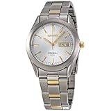 Titanium case with a titanium bracelet. Fixed titanium bezel. Silver-tone dial with luminous gold-tone hands and index hour markers. Minute markers around the outer rim. Luminiscent hands and markers. Day of the week and date appears at the 3 o'clock position. Quartz movement. Scratch resistant hardlex crystal. Textured gold-tone crown. Solid case back. Case diameter: 36 mm. Case thickness: 8 mm. Deployment clasp. Water resistant at 50 meters/ 165 feet. Functions: hours, minutes, seconds, calendar. Seiko Silver Dial Titanium Mens Watch SGG603. Read more
